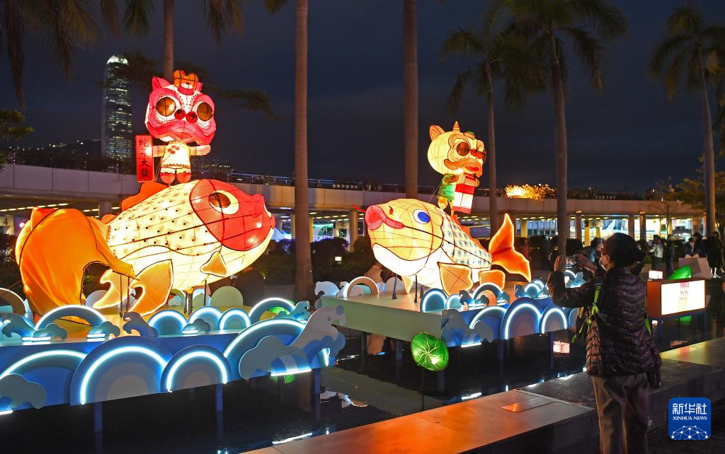 2月11日,人們?cè)谙愀奂馍尘着臄z彩燈。