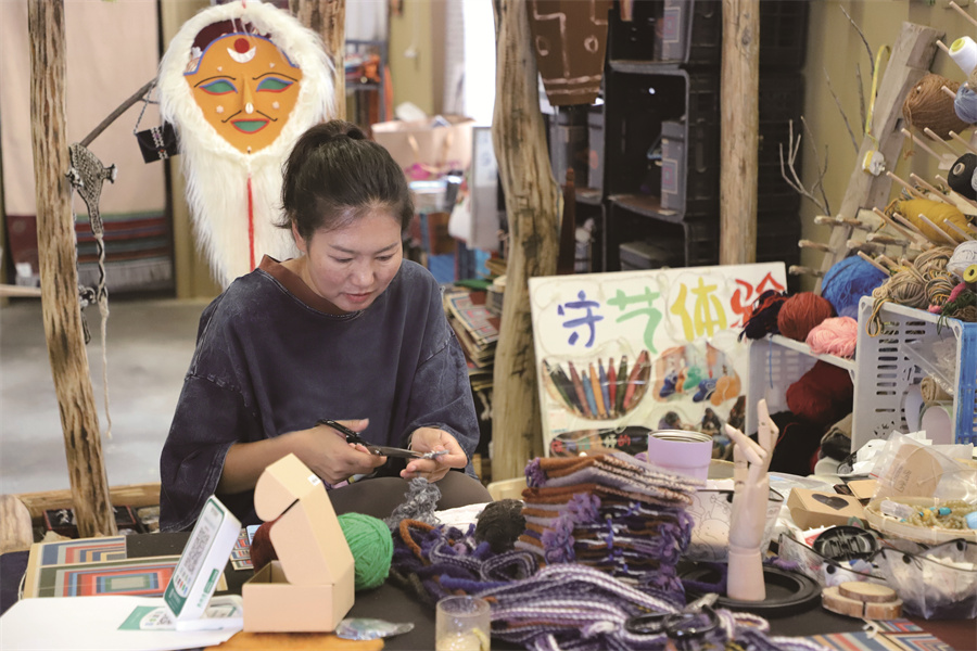 店鋪里的小動(dòng)物文創(chuàng),個(gè)個(gè)憨態(tài)可掬,毛絨絨、圓滾滾很討人喜歡;五彩織繩系著一顆用羊毛纏繞的湛藍(lán)色的心,伸手輕輕按壓時(shí),還會(huì)像心跳般微微起伏……各式各樣的文創(chuàng)包包同樣令人目不暇接。