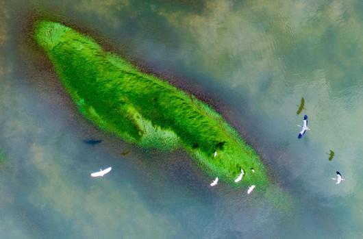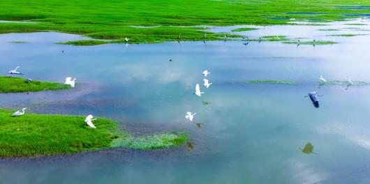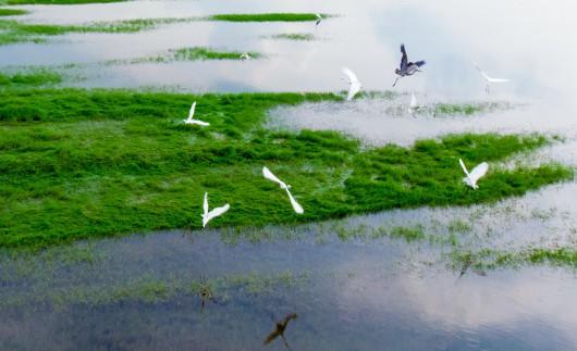 一群白鷺棲息在重慶濕地地帶。他們成群結(jié)對(duì),在這里覓食,綠色的草海成了它們的樂(lè)園。