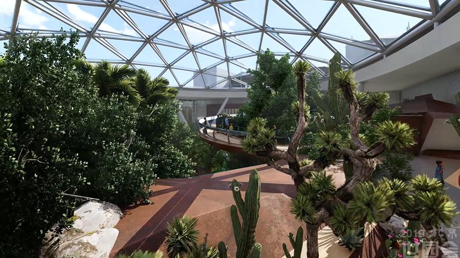 植物館建筑分為三層,一層設有熱帶植物溫室,占地約3000平方米,匯聚600多種珍貴植物。通過紅樹林、熱帶雨林、蕨類、棕櫚、多漿植物、食蟲植物、苔蘚等展現(xiàn)植物王國的多樣性以及植物生存和適應環(huán)境的智慧,設有5大展區(qū)12個景點。人工紅樹林,再現(xiàn)紅樹林適應海潮漲落演化出的胎生、支柱根、泌鹽等特征,彰顯海岸衛(wèi)士的生態(tài)功能;熱帶雨林著力展現(xiàn)植物與植物、植物與動物之間競爭、協(xié)同的關系,如空中花園、獨木成林、老莖生花、滴水葉尖、巨葉現(xiàn)象、絞殺現(xiàn)象等;棕櫚科植物和蕨類植物展示其卓越的傳播繁衍智慧;多漿植物通過莖葉的變態(tài)進化出適應干旱環(huán)境的能力;食蟲植物靠食肉來攝取營養(yǎng);植物王國的小矮人苔蘚如何找到適合自己的生存空間。展館通過一系列高科技創(chuàng)意手法,向參觀者充分展示“植物的智慧”,呼喚人類保護植物,關愛地球,關注人類的未來。