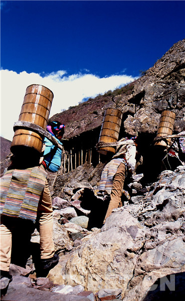 鹽田里的事自古就是由女人操持的,按她們的解釋是因?yàn)槟腥舜中?,?huì)弄臟了白花花的鹽,賣不出好價(jià)去。所以男人就負(fù)責(zé)運(yùn)輸和銷售工作,他們會(huì)在女人已經(jīng)曬出小山樣的一堆鹽巴時(shí),趕著騾馬來把鹽馱走,然后跋山涉水到巴塘、德欽、昌都一帶,換錢糧或者茶葉。而女人就用自己的雙肩背起水桶,下到陡峭的江邊汲水,再沿著細(xì)小的棧道背到用木支架撐起的鹽田里,等無數(shù)桶鹵水將鹽田灌滿后,剩下的就是盼著陽光和風(fēng)快快將水分蒸干,第二天就可以收獲了。她們就這樣日復(fù)一日年復(fù)一年地將狹窄的山路踩踏了千萬遍。