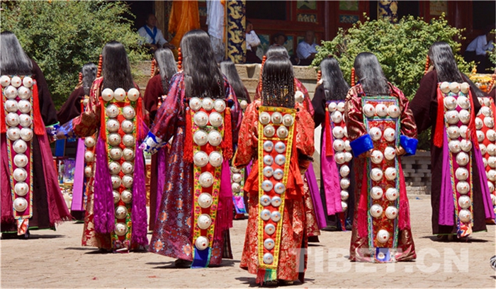 六月會(huì)期間有多場(chǎng)舞蹈表演,參與者是年輕的未婚女子,她們穿上最隆重的藏袍,綴上珊瑚蜜蠟松石銀飾,精施粉黛,莊重優(yōu)雅地舉手抬步緩行。舞蹈的動(dòng)作簡(jiǎn)單緩慢,但是女孩子們個(gè)個(gè)奪目。