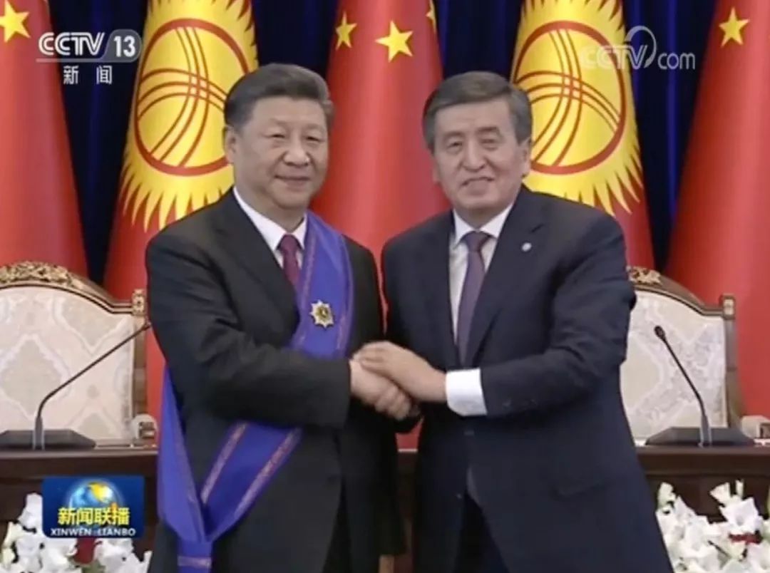 6月12日,習近平主席抵達吉爾吉斯斯坦首都比什凱克時,吉總統(tǒng)熱恩別科夫親自前往機場迎接,并舉行隆重歡迎儀式。期間,習近平被授予吉爾吉斯斯坦國家最高獎?wù)隆艾敿{斯”一級勛章。