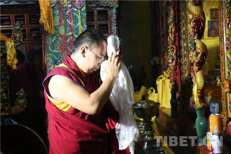 伴隨著裊裊桑煙、陣陣佛樂,十一世班禪緩步走進帕巴寺主殿禮佛,并登上主殿寶座。帕巴寺僧尼為十一世班禪敬獻曼扎。稍后,十一世班禪帶領僧尼誦經祈福,并為從四面八方趕來、早已在此等候的信教群眾摸頂賜福。