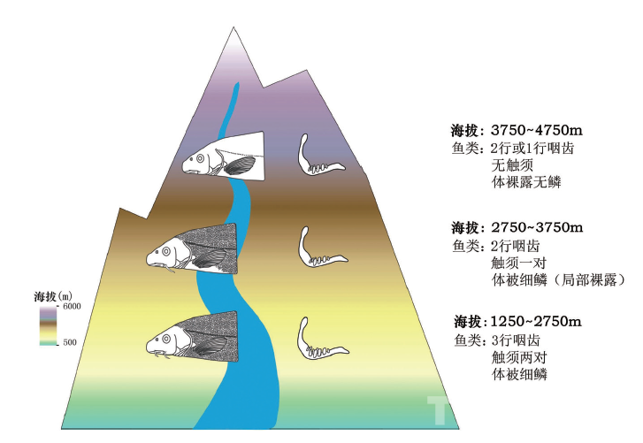 特化過程也與隆升階段相匹配。在藏北高原倫坡拉盆地海拔4550米的地層中,陳宜瑜發(fā)現(xiàn)了鯉科、鲃亞科魚類化石,經鑒定為新屬新種——隨海拔漸高正在適應演化的原始近裂腹魚屬。所在地層在地質學上被劃分為丁青組,屬地質第三紀一兩千萬年前。這個新屬的魚化石與同緯度平原地區(qū)溫暖水體中同類的最大區(qū)別,是脊椎骨數(shù)目增多,典型冷水魚特征。
