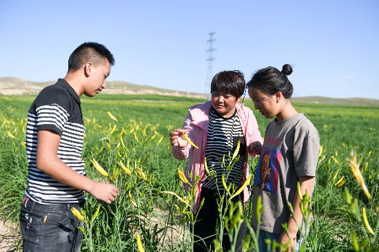 吳忠市太陽山清泉林業(yè)專業(yè)合作社負責人李志巧正在教兩名勤工儉學的孩子如何采摘黃花菜。