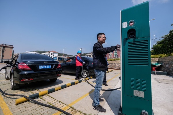 5月10日,游客在嵊泗縣菜園鎮(zhèn)高場灣村停車場刷卡給電動汽車充電。新華社記者 徐昱 攝