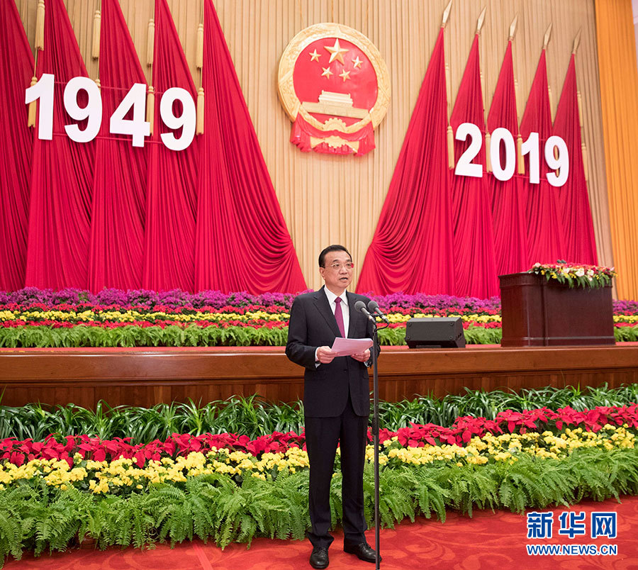 9月30日晚,慶祝中華人民共和國成立70周年招待會在北京人民大會堂隆重舉行。中共中央政治局常委、國務(wù)院總理李克強(qiáng)主持招待會。 新華社記者 黃敬文 攝