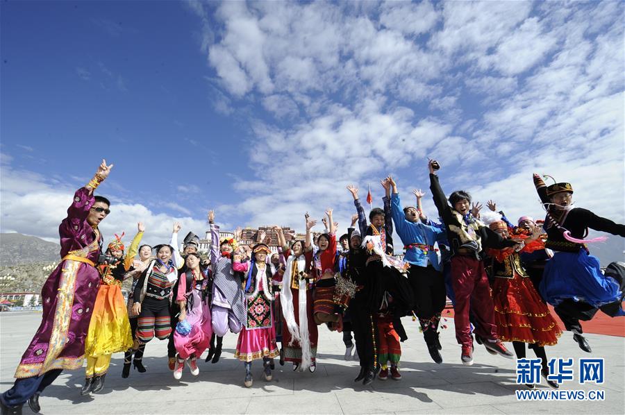 參加“民族情 雪域行”活動的民族團(tuán)結(jié)形象代表在西藏拉薩布達(dá)拉宮廣場合影(2012年9月27日攝)。新華社記者 覺果 攝