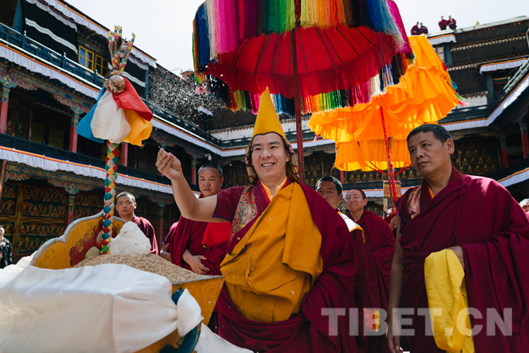在桑煙裊裊、法號齊鳴中,十一世班禪在扎什倫布寺僧人儀仗隊簇擁下緩步走進措欽大殿,邊走邊向僧俗信眾揮手致意,回應熱切期盼。