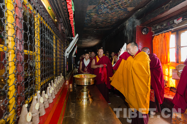 9月16日上午,按照宗教儀軌,十一世班禪在手持香爐高僧和吹嗩吶僧人的引領下,先后朝拜了釋頌南捷靈塔殿、強巴佛殿等主要佛殿并誦經(jīng)祈禱。