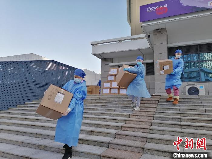 近日,武昌方艙醫(yī)院“管家”、武漢大學(xué)人民醫(yī)院對(duì)外聯(lián)絡(luò)部牽頭負(fù)責(zé)人沈嵐接受記者采訪(fǎng)。圖為沈嵐(左一)在方艙醫(yī)院搬運(yùn)物資。武大人民醫(yī)院供圖