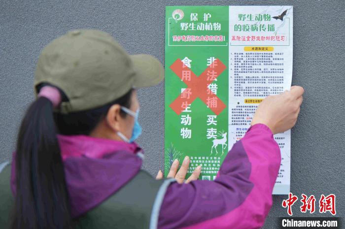 志愿者張貼“禁食野味”的海報(bào)?!⊥鹾I 攝