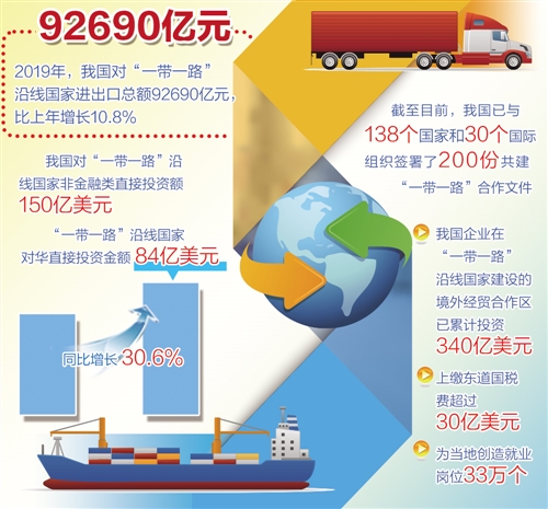 2019年,我國對“一帶一路”沿線國家進出口總額92690億元,比上年增長10.8%。其中,出口增長13.2%,進口增長7.9%,雙向投資深入發(fā)展。受疫情影響,今年前8個月,我國與“一帶一路”沿線國家外貿(mào)進出口合計5.86萬億元,同比增長0.5%,占我國外貿(mào)進出口總值的比重為29.2%,比去年同期提升0.3個百分點。