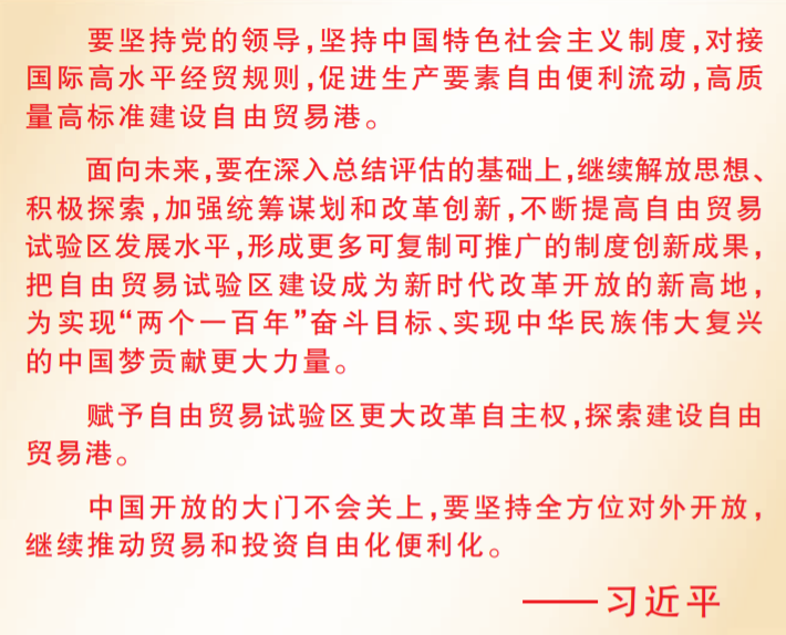“建設(shè)自由貿(mào)易試驗(yàn)區(qū)是黨中央在新時(shí)代推進(jìn)改革開放的一項(xiàng)戰(zhàn)略舉措,在我國改革開放進(jìn)程中具有里程碑意義?!?/p>