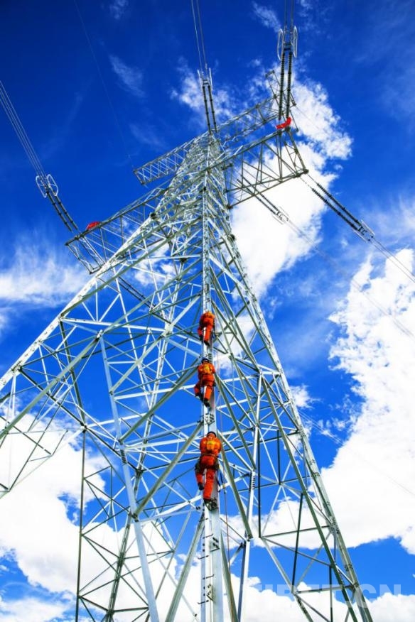 圖為國(guó)家電網(wǎng)公司員工在海拔4000米上塔作業(yè)
