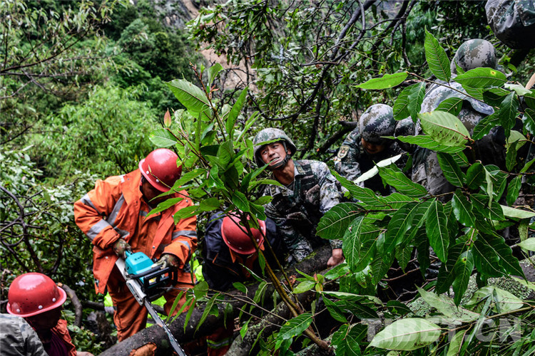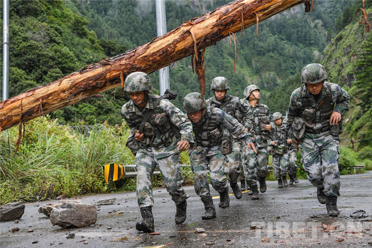 “山體滑坡帶下來的亂石和粗大的樹干擋住了去路,塌方面積不大,現(xiàn)在挖掘機(jī)正在作業(yè),跟當(dāng)?shù)厝藛T溝通,他們說預(yù)計下午能搶通?!?巴桑爬上塌方的亂石堆觀察后,跑回來跟帶隊(duì)的副營長張為鵬報告情況。