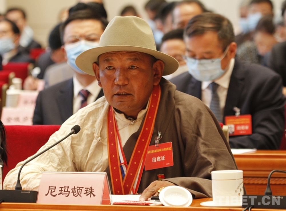 圖為阿里地區(qū)改則縣物瑪鄉(xiāng)搶古村黨支部書記尼瑪頓珠在各族各界慶祝西藏自治區(qū)成立55周年座談會(huì)上發(fā)言 攝影:趙朗