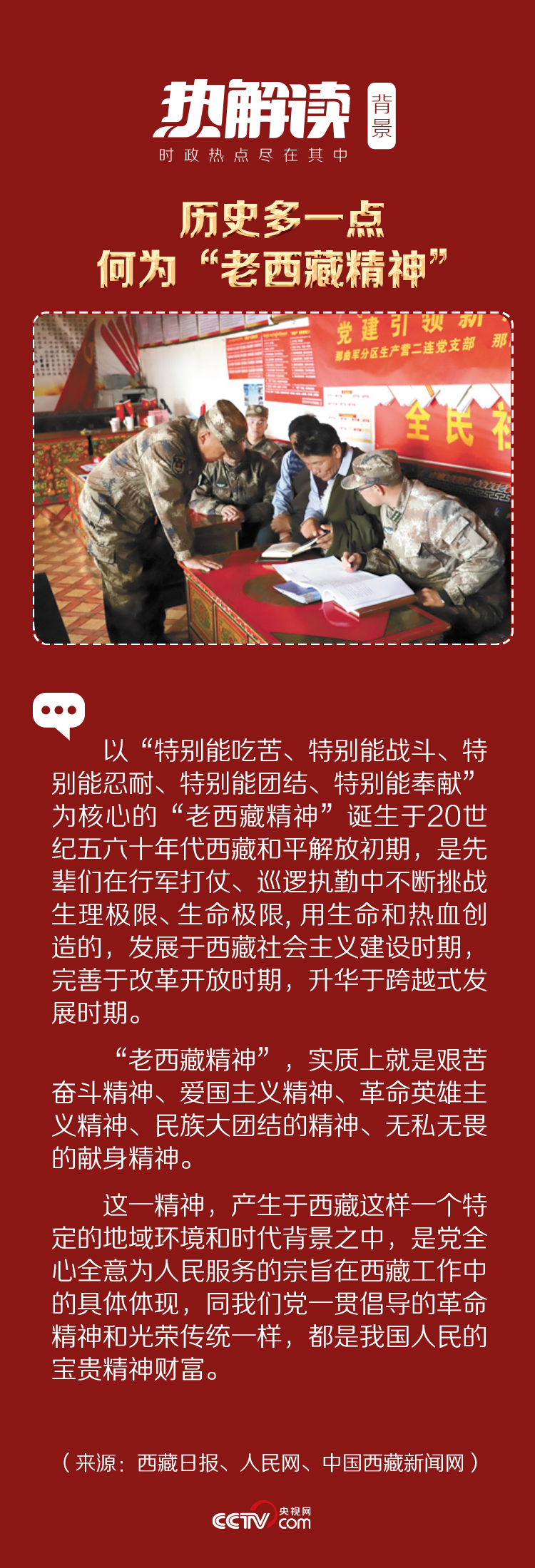 那些背著背包以雙腳征服14座海拔5000多米險峻雪山的中國人民解放軍將士,用軍魂熔鑄“老西藏精神”;寫出“冰山愈冷情愈熱,耿耿忠心照雪山”詩句的援藏干部孔繁森,用生命踐行“老西藏精神”;滔滔江河上搭金橋、重重險山間辟大道,迢迢天路無言訴說著“老西藏精神”;“玉麥每一個人都是祖國的坐標(biāo)”,在西藏長達(dá)4000多公里的邊境線上,數(shù)不清的黨員干部默默踐行傳承著“老西藏精神”……