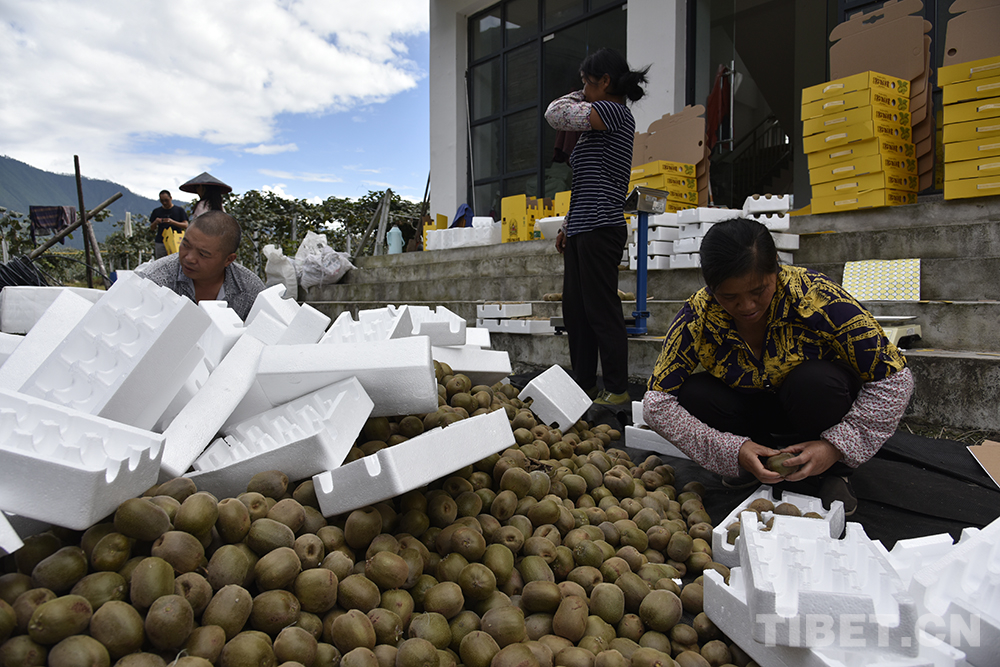 圖為下察隅鎮(zhèn)夏尼村獼猴桃種植基地,工人們正在包裝獼猴桃 攝影:王媛媛