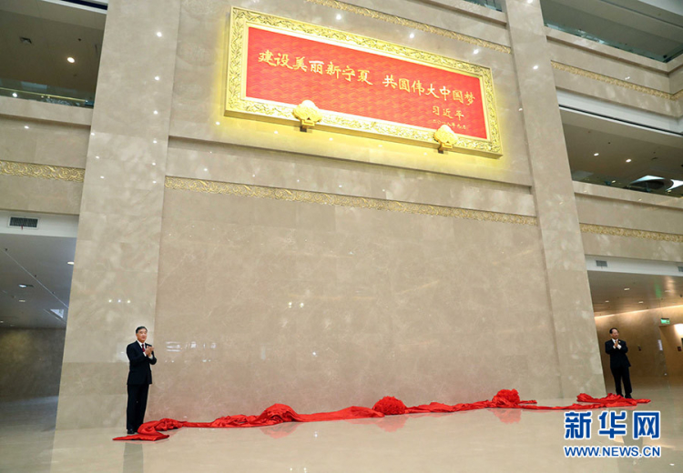 2018年9月19日,中共中央政治局常委、全國政協(xié)主席、中央代表團團長汪洋率中央代表團出席向?qū)幭幕刈遄灾螀^(qū)贈送紀念品儀式。這是汪洋和時任寧夏回族自治區(qū)黨委書記、人大常委會主任石泰峰一同為習(xí)近平總書記題詞賀匾揭幕。攝影:新華社記者 劉衛(wèi)兵