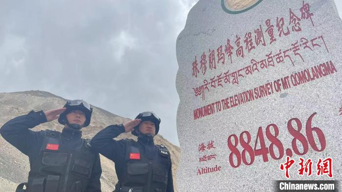 圖為珠峰邊境派出所民警在最新高程碑前敬禮。珠峰邊境派出所供圖