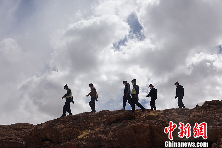 扎西崗邊境派出所民警索朗曲扎(左一)和隊(duì)友在巡邏路上。冉文娟 攝