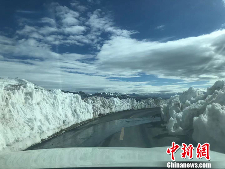 2021年6月,阿里地區(qū)札達(dá)縣通往楚魯松杰鄉(xiāng)的公路旁仍被厚厚的積雪覆蓋。冉文娟 攝