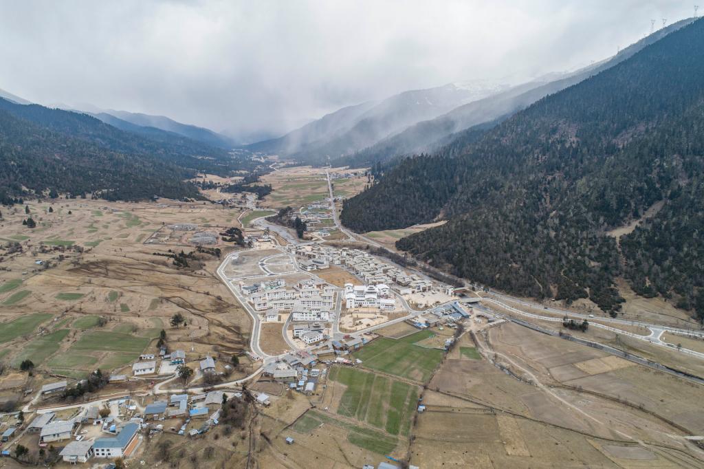 這是川藏公路旁的魯朗國(guó)際旅游小鎮(zhèn)(4月2日攝,無人機(jī)照片)。新華社記者 孫非 攝