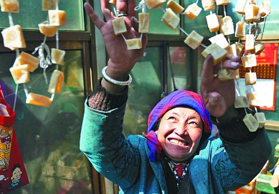 我國海拔最高鄉(xiāng)——西藏山南市浪卡子縣普瑪江塘鄉(xiāng),牧民生產(chǎn)生活條件得到極大改善。圖為當(dāng)?shù)貗D女在晾曬奶渣。新華社發(fā)