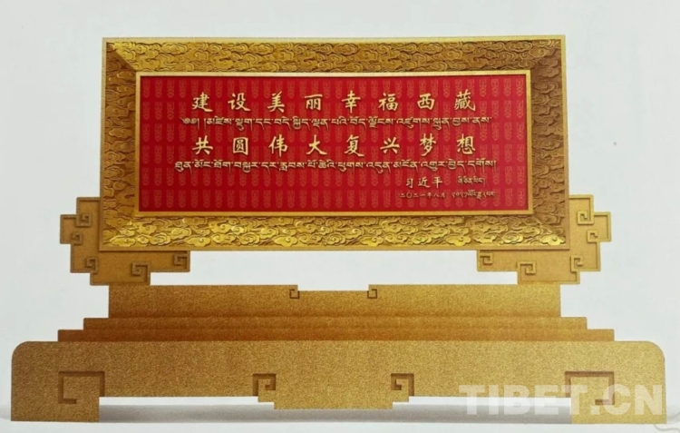 習(xí)近平總書記題詞的“建設(shè)美麗幸福西藏 共圓偉大復(fù)興夢想”賀匾
