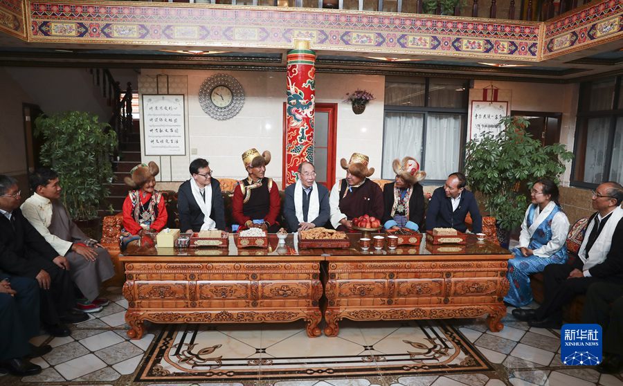 8月20日,中央代表團山南、日喀則分團帶著以習(xí)近平同志為核心的黨中央的深切關(guān)懷和全國人民的深情祝福,分別看望慰問當(dāng)?shù)馗髯甯鹘绺刹咳罕?。這是中共中央書記處書記、中央統(tǒng)戰(zhàn)部部長、中央代表團副團長尤權(quán)率山南分團在山南市乃東區(qū)昌珠鎮(zhèn)扎西曲登社區(qū)走進居民次仁家看望慰問。新華社記者 丁林 攝