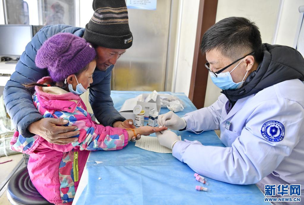 4月20日,在巡診車上,山東省煙臺(tái)市第五批援藏醫(yī)療隊(duì)醫(yī)生焦有誠(右)為亞來鄉(xiāng)歐熱村村民采血檢驗(yàn)。新華社記者 張汝鋒 攝