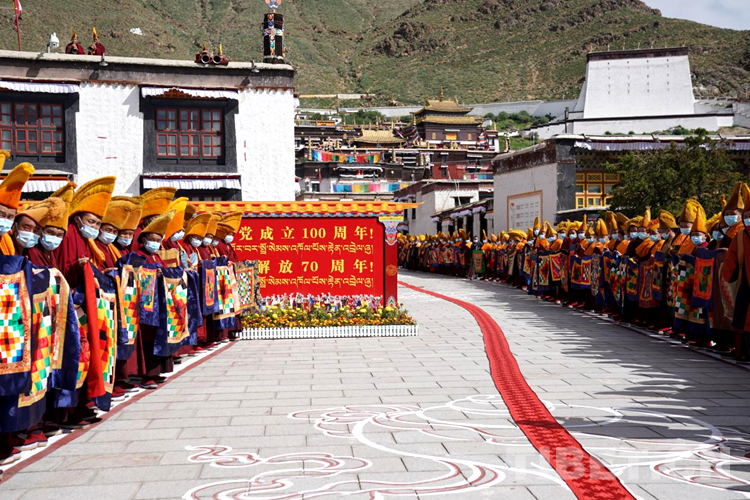 高懸著“護國利民”金匾的措欽大殿內(nèi),班禪虔誠叩拜了供奉于此的佛祖釋迦牟尼佛像和藏傳佛教格魯派創(chuàng)始人宗喀巴像,并與僧眾共同念誦經(jīng)文。