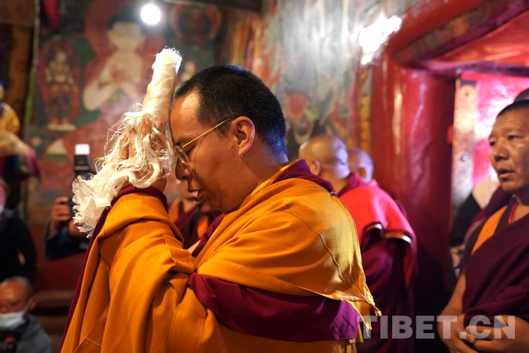當日下午,班禪登上拉讓日光殿寶座,接受扎什倫布寺管委會僧人成員、高僧的朝拜,為他們摸頂賜福,并帶領(lǐng)高僧集體誦經(jīng)祈禱。