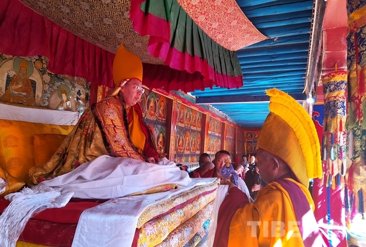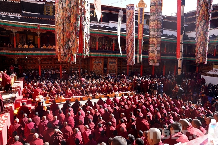 上午10時(shí),隨著法號(hào)響起,領(lǐng)經(jīng)師領(lǐng)經(jīng)下僧眾開始集體誦經(jīng),班禪由手持香爐和吹嗩吶僧人引路來(lái)到扎什倫布寺多加大院。慶祝儀式上,扎什倫布寺高僧活佛、各寺廟僧尼代表及班禪親屬依次敬獻(xiàn)曼扎、禮品。同時(shí),扎什倫布寺僧人在會(huì)場(chǎng)上以辯經(jīng)、跳“卡爾”舞等方式祝賀,并向現(xiàn)場(chǎng)信教群眾發(fā)放酥油茶、人參果、八寶飯等,共沾法喜。場(chǎng)面恢宏,恭敬威儀。