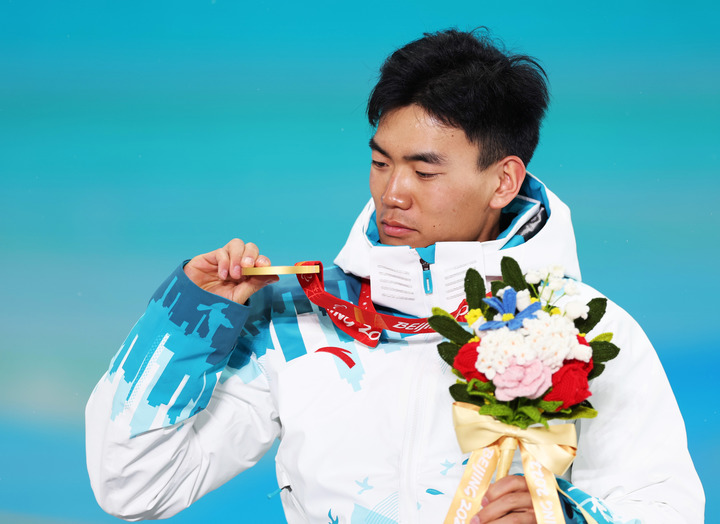 3月6日,冠軍中國(guó)選手劉子旭在北京冬殘奧會(huì)冬季兩項(xiàng)男子短距離(坐姿)獎(jiǎng)牌頒發(fā)儀式上。新華社記者賈浩成攝