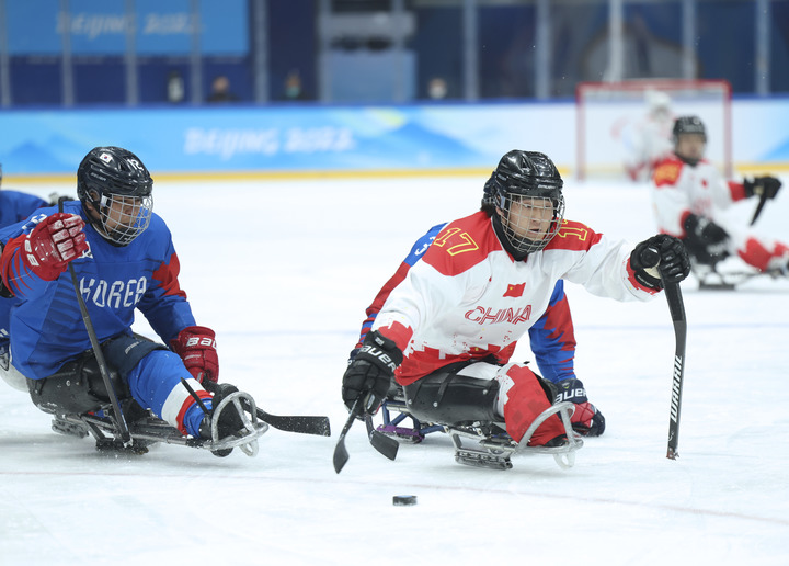 3月12日,中國(guó)隊(duì)球員申翼風(fēng)(右)在北京冬殘奧會(huì)冰球銅牌賽中進(jìn)攻。新華社記者蘭紅光攝