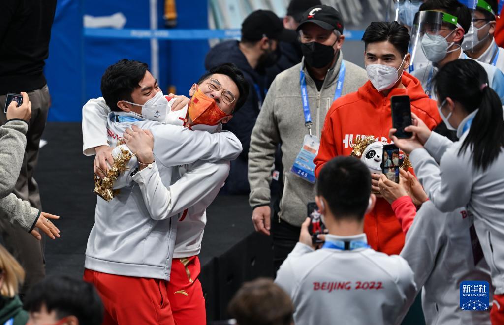 2月7日,任子威(左一)在比賽后與工作人員慶祝。新華社記者 蘭紅光 攝