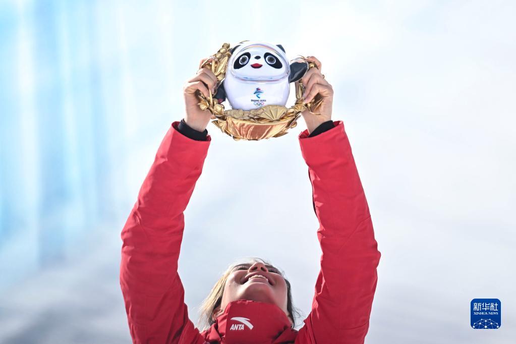 2月15日,中國(guó)選手谷愛凌在頒發(fā)紀(jì)念品儀式上。新華社記者 肖藝九 攝