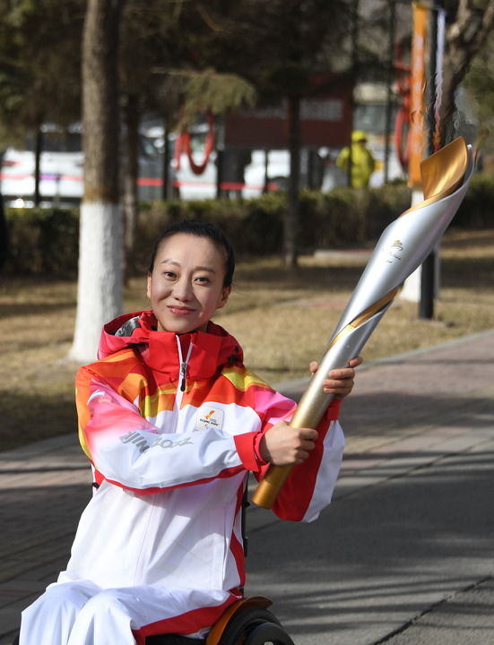 3月4日,火炬手劉巖在北京冬殘奧會火炬?zhèn)鬟f活動中。新華社記者李欣攝