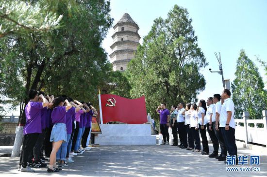 黨員干部在延安市寶塔山重溫入黨誓詞(2020年6月29日攝)。新華社記者 張博文 攝