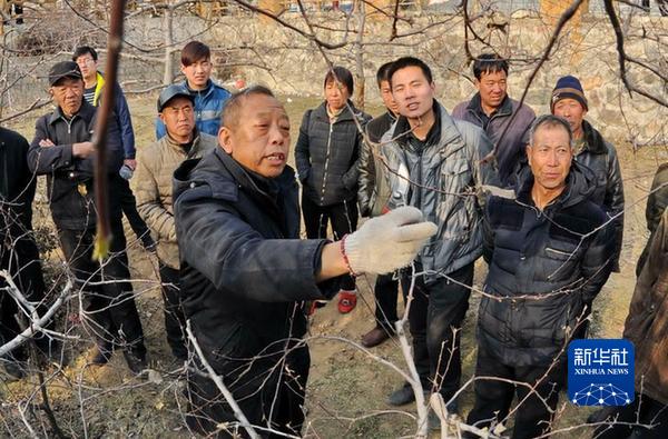 2016年1月27日,李保國(guó)(前左)在河北省內(nèi)丘縣崗底村向村民講解果樹(shù)修剪知識(shí)。新華社記者 朱旭東 攝