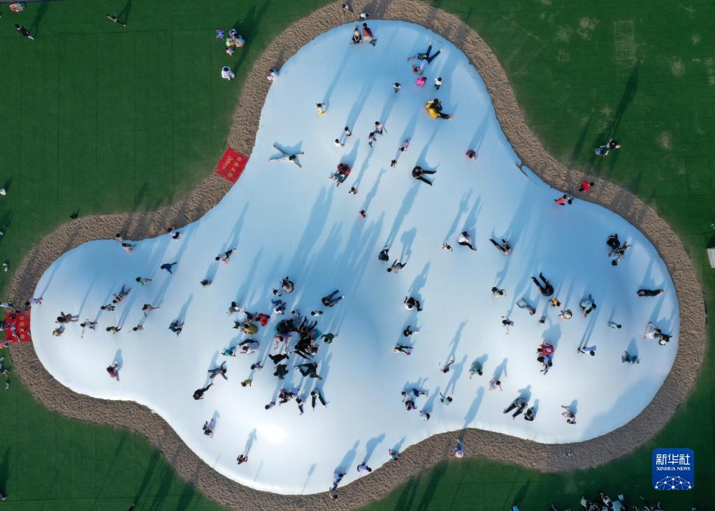 在江西省贛州市章貢區(qū)沙河鎮(zhèn)的羅坑體育特色小鎮(zhèn),游客在體驗(yàn)戶(hù)外蹦床項(xiàng)目(2020年11月15日攝,無(wú)人機(jī)照片)。新華社記者 彭昭之 攝