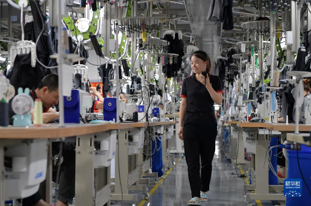 在江西省于都縣一家服裝生產(chǎn)基地內(nèi),生產(chǎn)小組小組長(zhǎng)在巡查生產(chǎn)線(xiàn)(2020年7月17日攝)。新華社記者 彭昭之 攝