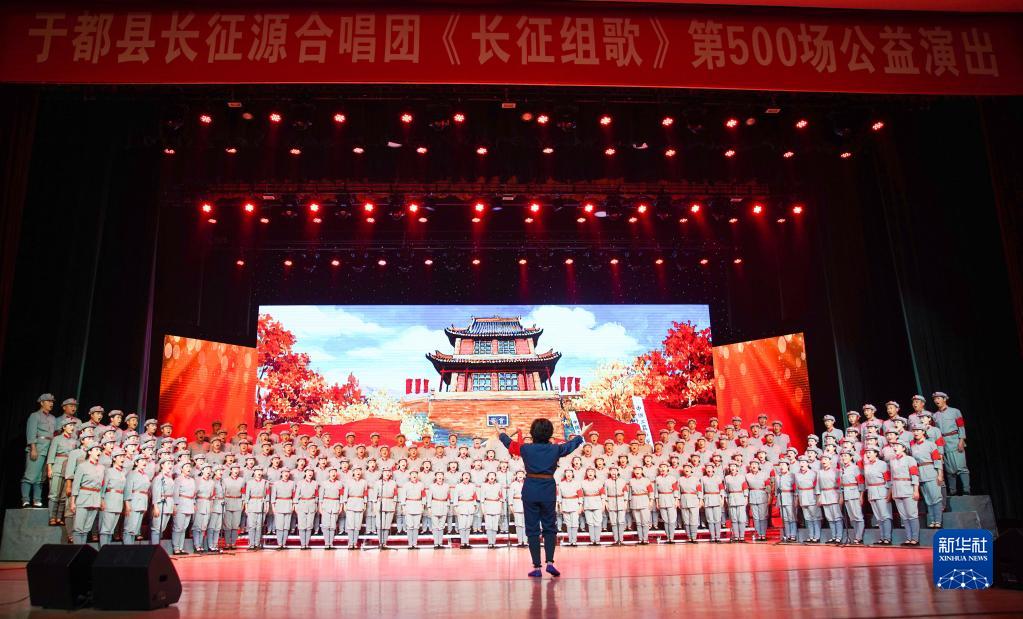 江西省于都縣長(zhǎng)征源合唱團(tuán)在該縣文化藝術(shù)中心進(jìn)行第500場(chǎng)《長(zhǎng)征組歌》公益演出(5月19日攝)。新華社記者 陳曄華 攝