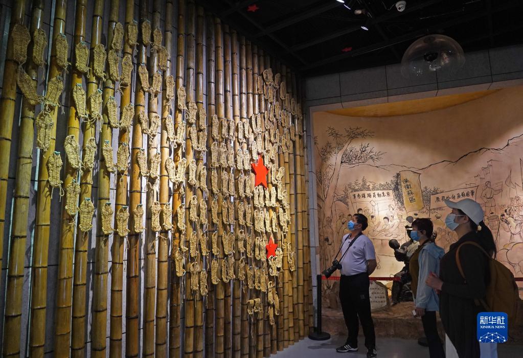 在江西省于都縣中央紅軍長(zhǎng)征出發(fā)紀(jì)念館,游客在參觀草鞋組成的“草鞋墻”(4月30日攝)。新華社記者 萬(wàn)象 攝