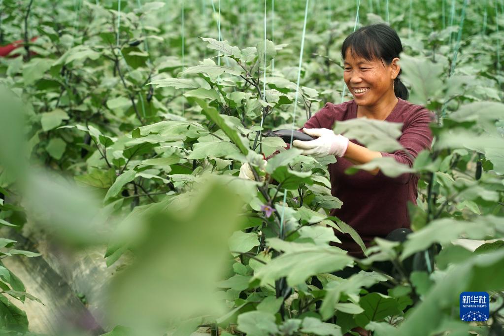 在江西省贛州市于都縣梓山鎮(zhèn)潭頭村的果蔬種植基地,村民在采摘茄子(2020年10月21日攝)。新華社記者 萬(wàn)象 攝