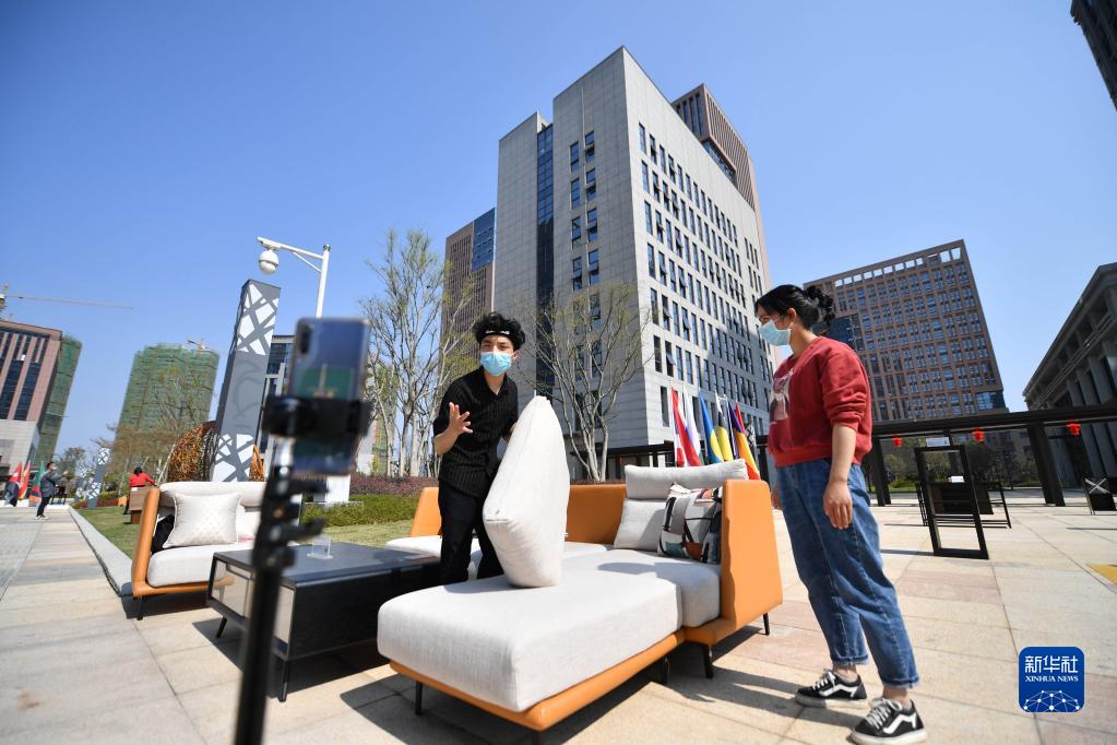 在江西省贛州市南康區(qū)跨境電商產(chǎn)業(yè)園,員工通過(guò)手機(jī)直播的形式推銷(xiāo)家具(2020年2月26日攝)。新華社記者 胡晨歡 攝