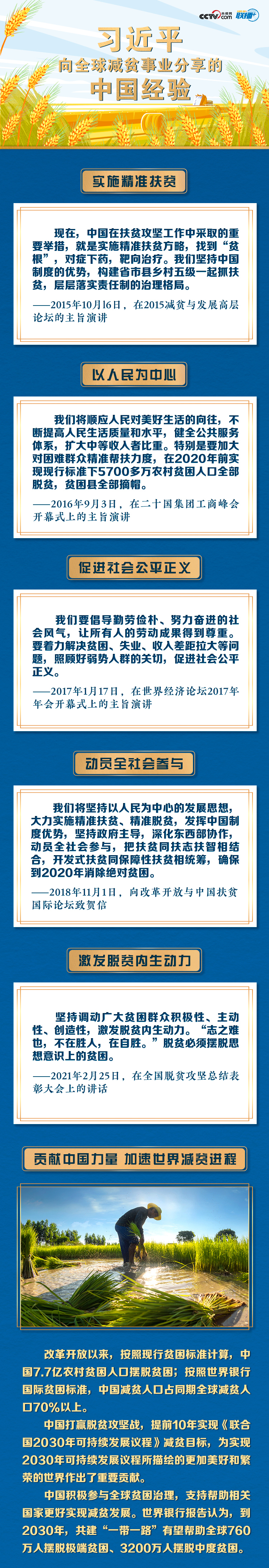 消除貧困,自古以來就是人類夢寐以求的理想,是各國人民追求幸福生活的基本權利。這些年來,習近平主席多次在重要活動中闡釋中國理念、分享中國經驗,推動全球減貧事業(yè)大踏步向前。中國在擺脫貧困方面取得的非凡成就為國際社會帶來希望、提供激勵,為推動構建人類命運共同體貢獻了中國力量。